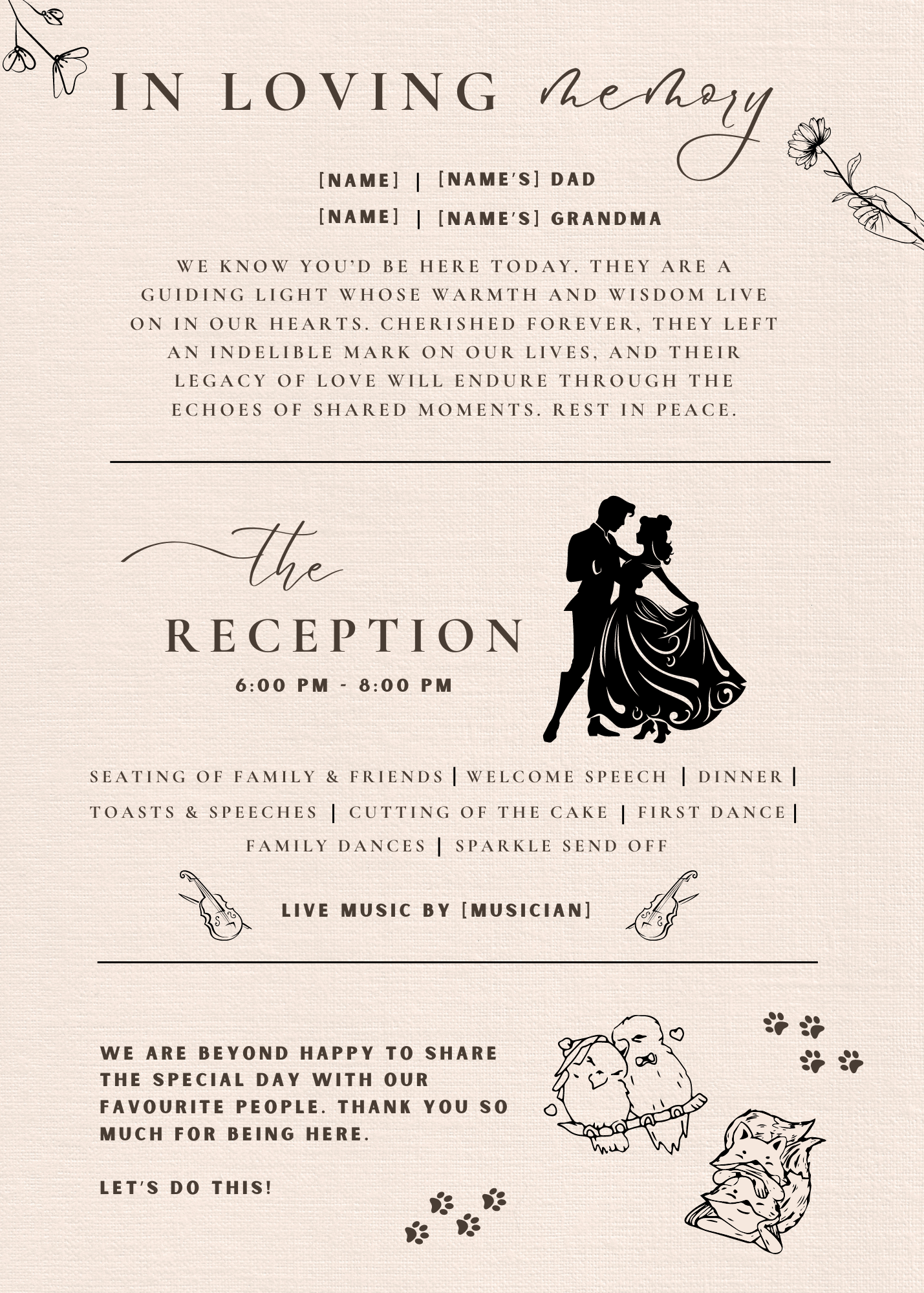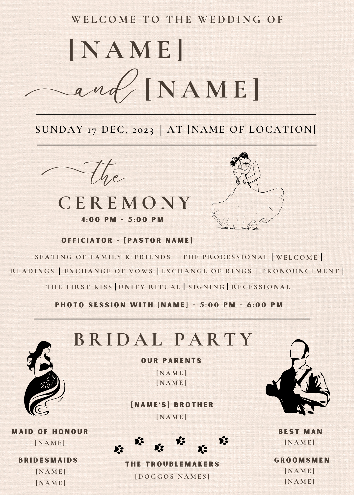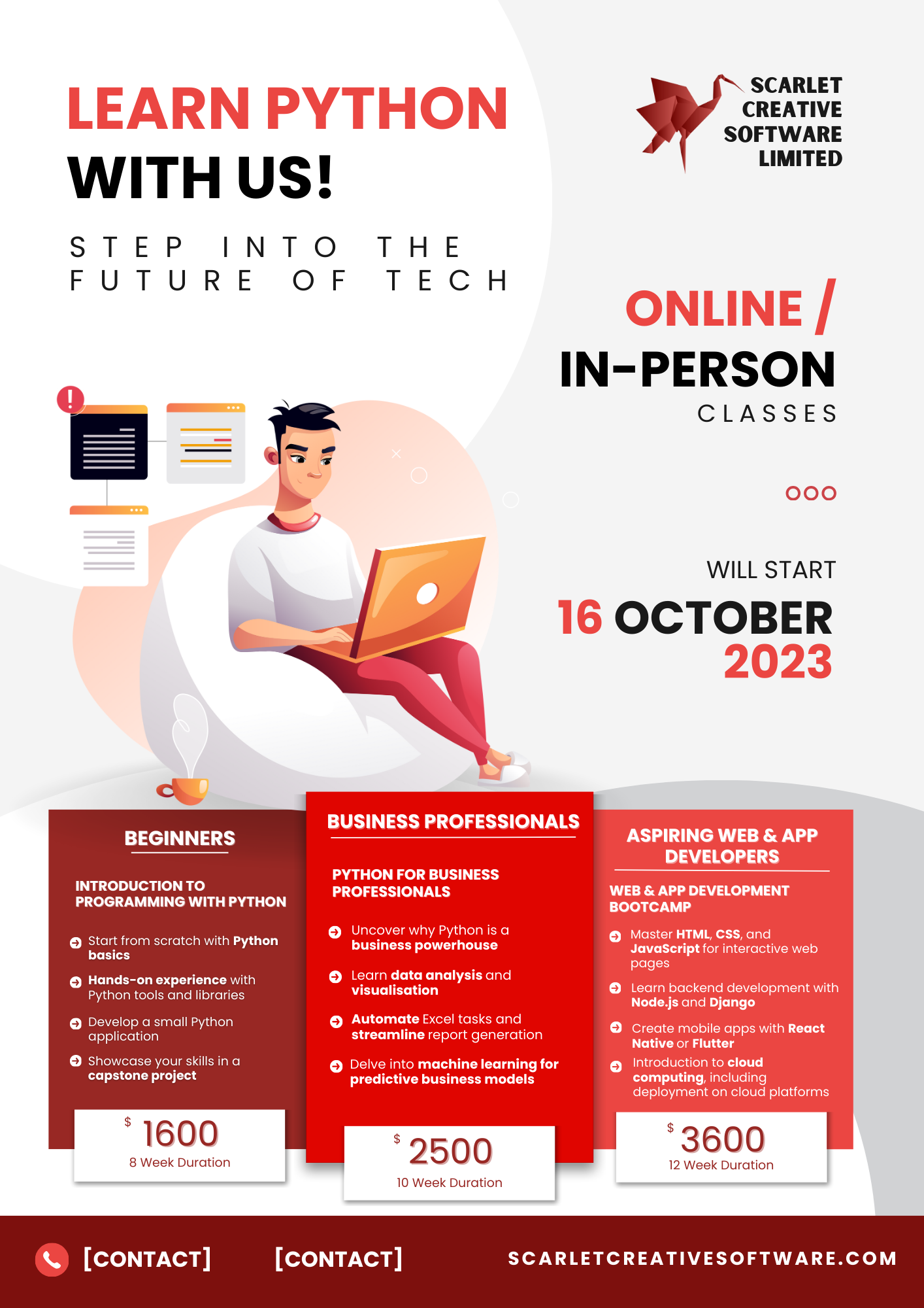We designed a captivating flyer to promote a Python programming course, highlighting its benefits to attract learners and encourage action, and Wedding essentials were created using Canva, including a beautifully designed wedding programme, menus for food, drinks, and desserts, as well as wedding invitations. Each element was meticulously crafted to reflect the couple's style and the ambiance of their special day. By incorporating illustrations, chosen color schemes, and elegant typography, it was ensured that every piece exudes sophistication and effectively conveyed essential event information.